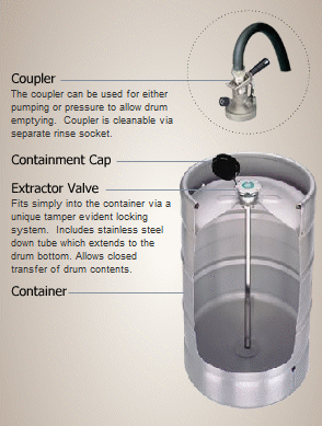 Connects to keyed extractor valve to allow drum emptying via separate pump or pressure source.